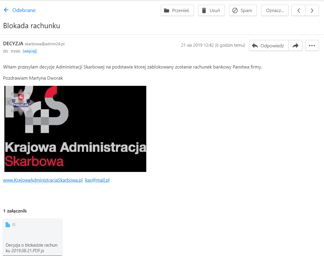 Do wiadomości jest także dołączony załącznik z decyzją o blokadzie, jednak nie należy go otwierać.