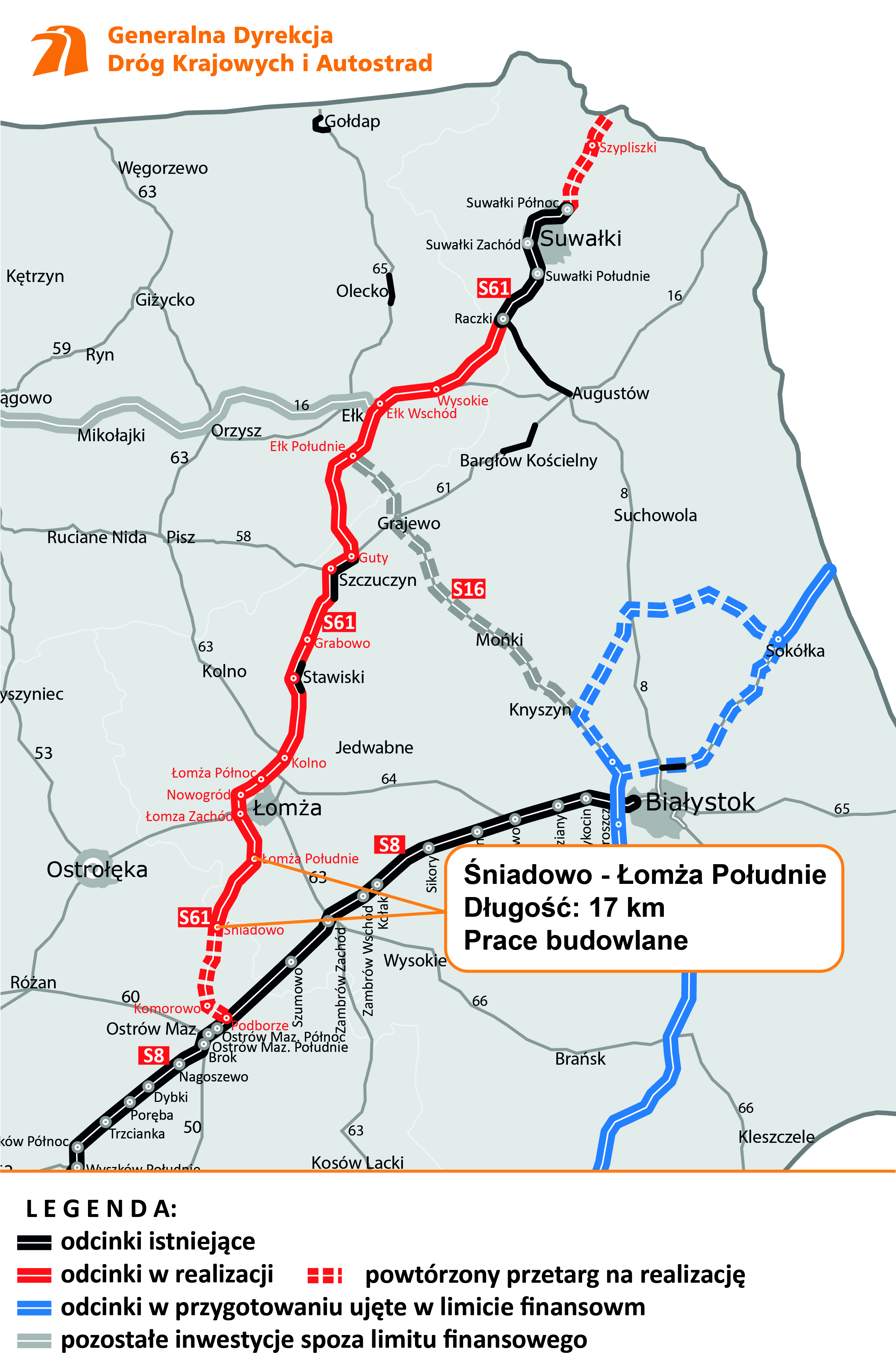 Inwestycja rozpocznie się na terenie województwa mazowieckiego w powiecie ostrołęckim (na obszarze 2 km), pozostała jej część będzie prowadzona na terenie powiatu łomżyńskiego w województwie podlaskim. Wartość umowy z wykonawcą to 380 mln zł.