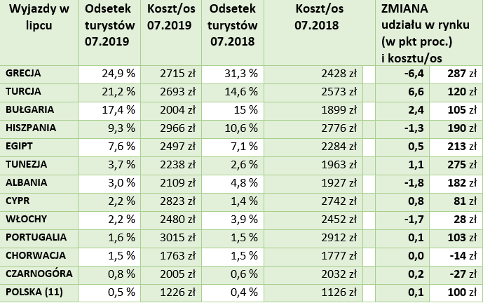 Pierwszą piątkę uzupełnił Egipt z 7,6-procentowym udziałem. Tuż za pierwszą piątką w lipcu uplasowała się Tunezja. Wakacje w lipcu 2019 okazały się droższe w tym kraju aż o 275 złotych od osoby w porównaniu z ubiegłym rokiem ale wciąż kosztują znacznie mniej niż w Egipcie czy Turcji, a więc krajach gdzie turyści kupują wakacje w najwyższym, pięciogwiazdkowym standardzie.