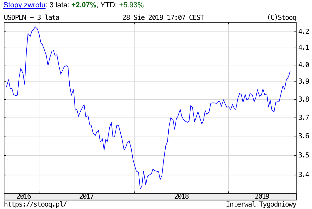 Notowania pary USD/PLN w ostatnich trzech latach: